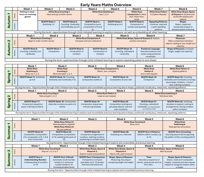 Teachers in Early Years follow the NCETM Mastering Number Planning for their daily adult led lesson and use the White Rose Planning and Development Matters Document to supplement and enrich the curriculum and for continuous and enhanced provision for Child Initiated Learning (C.I.L).