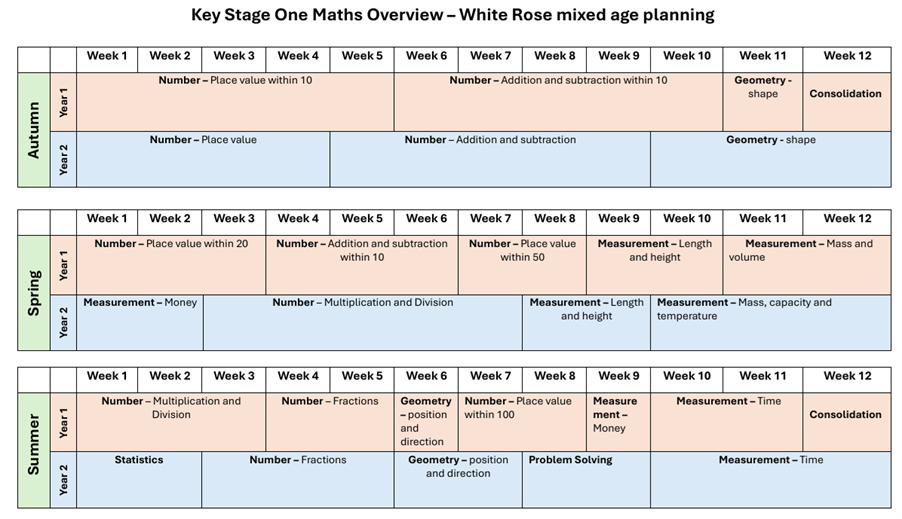 KS1 and KS2 follow White Rose Planning, supplemented by NCETM Mastery materials.